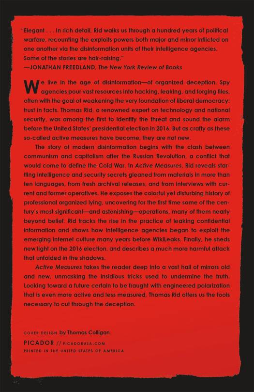 We live in the age of disinformation--of organized deception. Spy agencies pour vast resources into hacking, leaking, and forging data, often with the goal of weakening the very foundation of liberal democracy: trust in facts. Thomas Rid, a renowned expert on technology and national security, was one of the first to sound the alarm. More than four months before the 2016 election, he warned that Russian military intelligence was "carefully planning and timing a high-stakes political campaign" to disrupt the democratic process. But as crafty as such so-called active measures have become, they are not new.