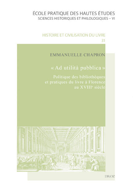 Entre les règnes des derniers Médicis et ceux des grands-ducs Habsbourg-Lorraine, le paysage des bibliothèques florentines se transforme profondément. Se succèdent l’ouverture de deux bibliothèques publiques au milieu du XVIIIe siècle, la constitution de fonds spécialisés dans les institutions scientifiques de la ville, la dispersion de nombreuses collections ecclésiastiques, les vicissitudes de la bibliothèque princière. Emmanuelle Chapron interroge les relations de cause à effet qu’entretient l’invention de ces nouveaux lieux de lecture avec, du point de vue de l’histoire intellectuelle, l’évolution contemporaine de la pratique du livre et, au regard de l’histoire politique, avec la mise en œuvre par la dynastie lorraine de nouveaux modes de légitimation du pouvoir souverain. Autant qu’à une histoire de la lecture, Ad utilità pubblica entend ainsi contribuer à la réflexion la plus récente sur le gouvernement de l’espace publique dans les Etats italiens du XVIIIe siècle.