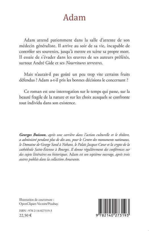 Adam attend patiemment dans la salle d'attente de son médecin généraliste. Il arrive au soir de sa vie, incapable de contrôler ses souvenirs, jusqu'à mettre en scène sa propre mort. Il essaie de s'évader dans les oeuvres de ses auteurs préférés, surtout André Gide et ses Nourritures terrestres. Mais n'aurait-il pas goûté un peu trop vite certains fruits défendus ? Adam a-t-il pris les bonnes décisions le concernant ? Ce roman est une interrogation sur le temps qui passe, sur la beauté fragile de la nature et sur les choix auxquels se confronte tout individu dans son existence.