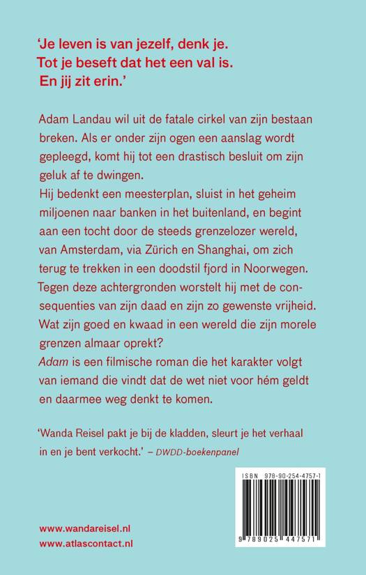 Adam van Wanda Reisel is een filmische roman die het karakter volgt van iemand die vindt dat de wet niet voor hém geldt en daarmee weg denkt te komen. Adam Landau wil uit de fatale cirkel van zijn bestaan breken. Als er onder zijn ogen een aanslag wordt gepleegd, komt hij tot een drastisch besluit om zijn geluk af te dwingen. Hij bedenkt een meesterplan, sluist in het geheim miljoenen naar banken in het buitenland, en begint aan een tocht door de steeds grenzelozer wereld, van Amsterdam, via Zürich en Shanghai, om zich terug te trekken in een doodstil fjord in Noorwegen. Tegen deze achtergronden worstelt hij met de consequenties van zijn daad en zijn zo gewenste vrijheid. Wat zijn goed en kwaad in een wereld die zijn morele grenzen almaar oprekt?