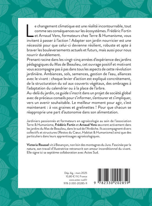 Le changement climatique est une réalité incontournable, tout comme ses conséquences sur les écosystèmes. Frédéric Fortin et Arnaud Vens, formateurs chez Terre & Humanisme, vous invitent à passer à l'action ! Adapter son jardin nourricier est une nécessité pour que celui-ci devienne résilient, robuste et apte à braver les bouleversements actuels et futurs, mais aussi pour nous nourrir durablement. Prenant racine dans les vingt-cinq années d'expérience des jardins pédagogiques du Mas de Beaulieu, cet ouvrage positif et motivant vous accompagne pas à pas dans tous les aspects de cette révolution jardinière. Ambiances, sols, semences, gestion de l'eau, alliances avec le vivant : chaque levier d'action est expliqué concrètement, de la structuration du sol aux couverts végétaux, des ombrages à l'adaptation du calendrier ou à la place de l'arbre. Au-delà du jardin, ce guide s'inscrit dans un projet de société global avec de précieux conseils pour s'informer, s'entourer et s'impliquer, vers un avenir souhaitable. Le meilleur moment pour agir, c'est maintenant : à vos graines et grelinettes ! Pour que chacun se réapproprie une part d'autonomie dans son alimentation.