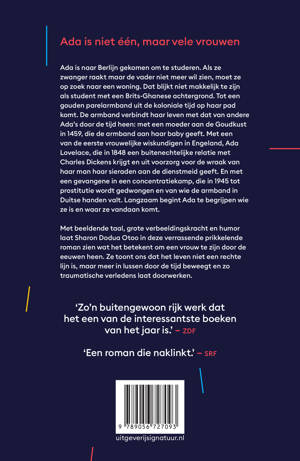 Ada is niet één, maar vele vrouwen. Ze is een moeder aan de Goudkust in 1459 die haar pasgeboren baby een gouden parelarmband geeft. De armband zal het lot van andere Ada’s door de eeuwen heen bepalen. In 1848 als ze een buitenechtelijke relatie krijgt met Charles Dickens. In 1945 als ze tot prostitutie wordt gedwongen in een concentratiekamp. En in hedendaags Berlijn als ze zwanger is, een woning probeert te vinden en de armband opduikt bij een tentoonstelling.