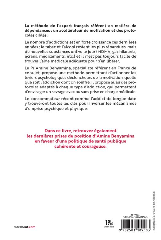 Le Pr Amine Benyamina, spécialiste référent en France de ce sujet, propose une méthode permettant d’actionner les leviers psychologiques déclencheurs de la motivation, quelle que soit l’addiction dont on souffre. Il propose aussi des protocoles adaptés à chaque type d’addiction, qui permettent d’envisager un sevrage avec ou sans prise en charge médicale.