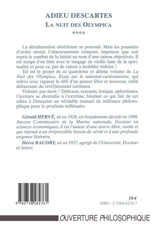 Cet ultime volume relève avec vigueur le défi d'un penser libre et nouveau, enfin débarrassé du rév(f)rentiel cartésien. Voltaire pas mort ! Tableaux, synopsis, lexique, aphorismes, l'écriture se diversifie à l'extrême, fondant ce qui fait cet adieu à Descartes un véritable manuel de militance philosophique pour le prochain millénaire.