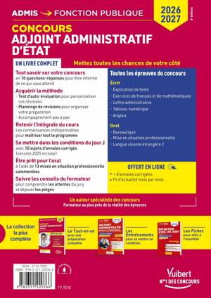 Un livre complet pour préparer et réussir le concours d'adjoint administratif d'État.Ce livre propose aux candidats aux concours externe et interne d'adjoint administratif d'État de 1re classe