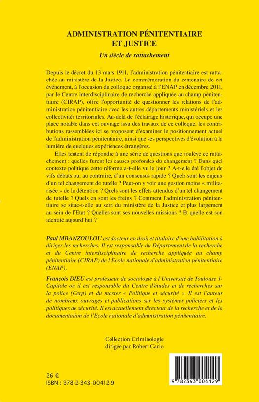 Depuis le décret du 13 mars 1911, l'administration pénitentiaire est rattachée au ministère de la Justice. Au-delà de l'éclairage historique, qui occupe une place notable dans cet ouvrage, les contributions réunies ici examinent le positionnement actuel de l'administration pénitentiaire, ainsi que ses perspectives d'évolution à la lumière de quelques expériences étrangères.