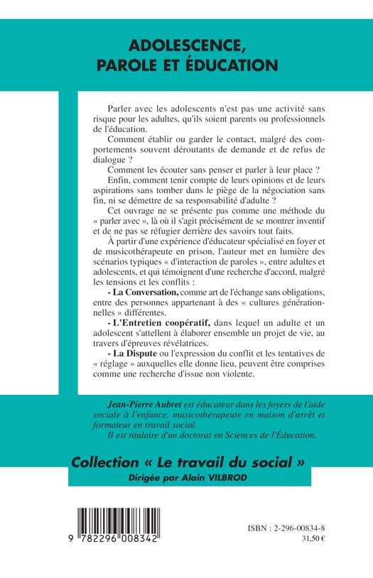 Comment établir ou garder le contact avec les adolescents, malgré des comportements souvent déroutants de demande et de refus de dialogue? Il s'agit de se montrer inventif et de ne pas se réfugier derrière des savoirs tout faits. A partir de diverses expériences, l'auteur met en lumière des scénarios typiques d'interaction de paroles qui témoignent d'une recherche d'accord malgré les tensions et les conflits : la Conversation, l'Entretien coopératif et la Dispute.