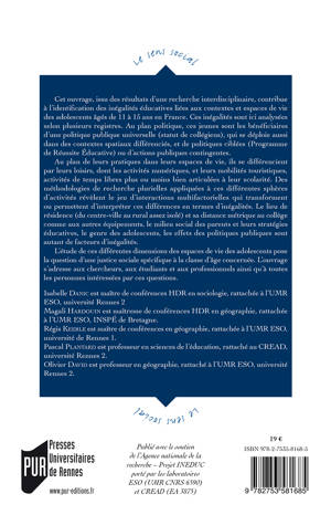 Cet ouvrage contribue à l'identification des inégalités éducatives liées aux contextes et espaces de vie des adolescents âgés de 11 à 15 ans en France. Le lieu de résidence et sa distance au collège comme aux autres équipements, le milieu social des parents et leurs stratégies éducatives, le genre des adolescents ou les effets des politiques publiques sont autant de facteurs d'inégalités. L'étude de ces différentes dimensions des espaces de vie des adolescents pose la question d'une justice sociale spécifique à la classe d'âge concernée.