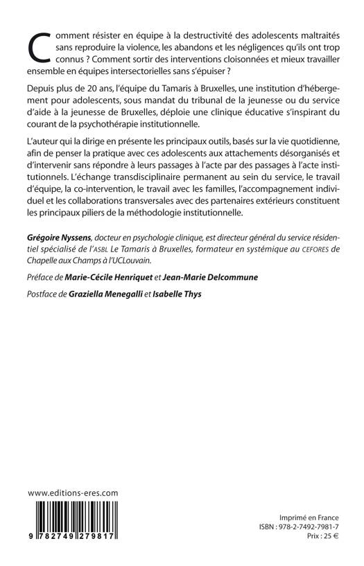 Depuis plus de 20 ans, l’équipe éducative du Tamaris à Bruxelles, une institution d’hébergement pour adolescents adressés par le tribunal ou les services de protection de l’enfance, déploie une clinique éducative s’inspirant du courant de la psychothérapie institutionnelle basée sur la vie quotidienne. L’auteur qui la dirige en présente les principaux outils qui permettent de penser la pratique au quotidien avec des adolescents aux attachements désorganisés et d’intervenir sans répondre à leurs passages à l’acte par des passages à l’acte institutionnels. L’échange transdisciplinaire permanent au sein du service, le travail d’équipe, la co-intervention, le travail avec les familles, l’accompagnement individuel et les collaborations transversales avec des partenaires extérieurs constituent les principaux piliers de la méthodologie institutionnelle.