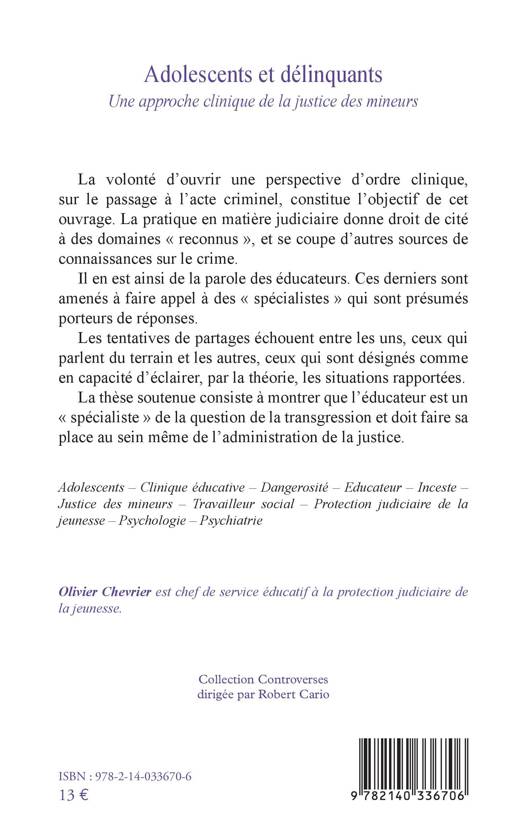 La volonté d'ouvrir une perspective d'ordre clinique, sur le passage à l'acte criminel, constitue l'objectif de cet ouvrage. La pratique en matière judiciaire donne droit de cité à des domaines reconnus, et se coupe d'autres sources de connaissances sur le crime. Il en est ainsi de la parole des éducateurs. Ces derniers sont amenés à faire appel à des spécialistes qui sont présumés porteurs de réponses. Les tentatives de partages échouent entre les uns, ceux qui parlent du terrain et les autres, ceux qui sont désignés comme en capacité d'éclairer, par la théorie, les situations rapportées. La thèse soutenue consiste à montrer que l'éducateur est un spécialiste de la question de la transgression et doit faire sa place au sein même de l'administration de la justice. Adolescents - Clinique éducative - Dangerosité - Educateur - Inceste - Justice des mineurs - Travailleur social - Protection judiciaire de la jeunesse - Psychologie - Psychiatrie