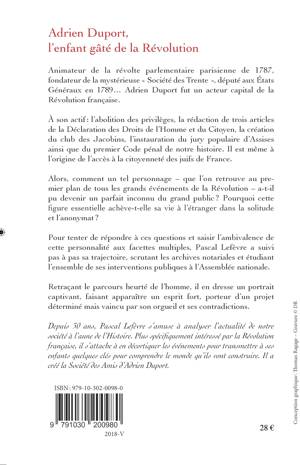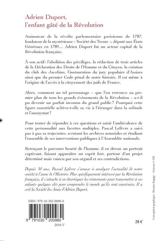 Animateur de la révolte parlementaire parisienne de 1787, fondateur de la mystérieuse « Société des Trente », député aux États Généraux en 1789 Adrien Duport fut un acteur capital de la Révolution française. À son actif : l'abolition des privilèges, la rédaction de trois articles de la déclaration des droits de l'homme et du citoyen, la création du club des Jacobins, l'instauration du jury populaire d'Assises ainsi que du premier code pénal de notre histoire. Il est même à l'origine de l'accès à la citoyenneté des juifs de France. Alors, comment un tel personnage - que l'on retrouve aux premiers plans de tous les grands évènements de la Révolution - a-t-il pu devenir un parfait inconnu du grand public ? Pourquoi cette figure essentielle achève-t-elle sa vie à l'étranger dans la solitude et l'anonymat ? Pour tenter de répondre à ces questions et saisir l'ambivalence de cette personnalité aux facettes multiples, Pascal Lefèvre a suivi pas à pas sa trajectoire, scrutant les archives notariales et décortiquant l'ensemble de ses interventions publiques à l'Assemblée nationale. Retraçant le parcours heurté de l'homme, il en dresse un portrait captivant faisant apparaitre un esprit fort, porteur d'un projet déterminé mais vaincu par son orgueil et ses contradictions.