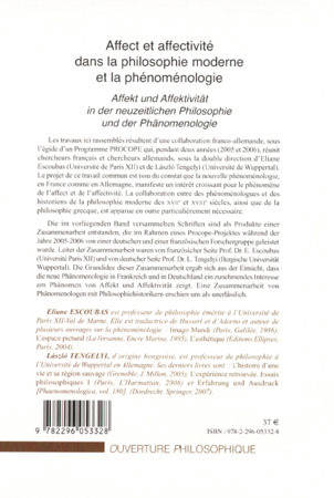Les travaux ici rassemblés résultent d'une collaboration de chercheurs français et allemands, phénoménologues et historiens de la philosophie moderne des XVII° et XVIII° siècles ayant constaté que la nouvelle phénoménologie, en France comme en Allemagne, manifeste un intérêt croissant pour le phénomène de l'affect et de l'affectivité. (Des articles en français, des articles en allemand).
