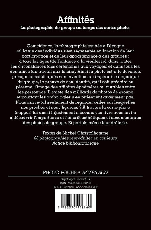 Durant plus d'un siècle, pour des millions d'êtres humains, la toute première approche de la photographie fut collective : l'expérience de la fameuse photo de classe se joue aussi dans les termes d'une initiation aux rites du portrait social... Chaque groupe, chaque communauté, chaque association d'individus singuliers éprouve la nécessité de s'identifier et de se reconnaître par la trace photographique. De ces "affinités" contraintes ou choisies mais mises en scène et fixées pour l'éternité, la photographie offre un panorama d'une richesse et d'une diversité extraordinaires dont ce nouveau titre de la collection "Photo Poche" propose un étonnant échantillon.