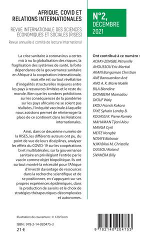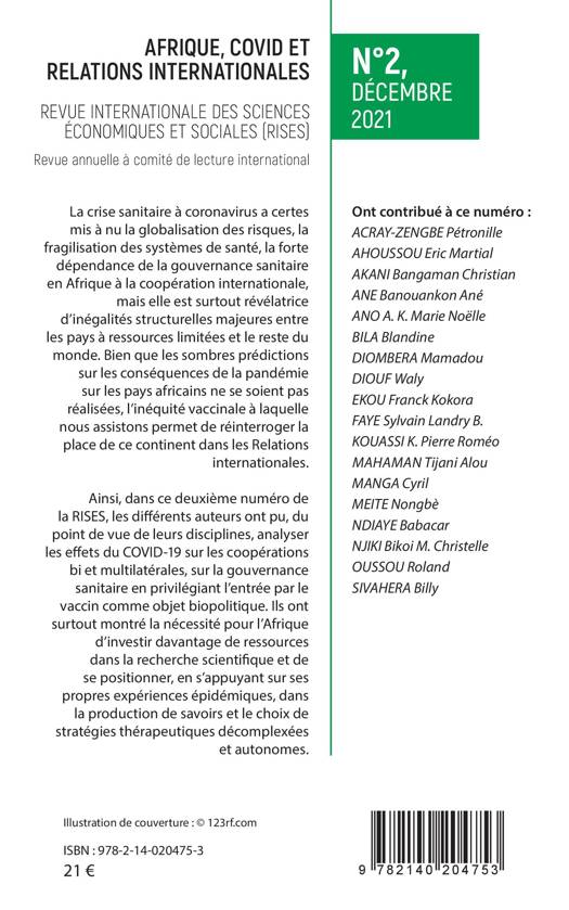 La crise sanitaire à coronavirus a certes mis à nu la globalisation des risques, la fragilisation des systèmes de santé, la forte dépendance de la gouvernance sanitaire en Afrique à la coopération internationale, mais elle est surtout révélatrice d'inégalités structurelles majeures entre les pays à ressources limitées et le reste du monde. Ainsi, dans ce deuxième numéro de la RISES, les différents auteurs ont pu analyser les effets du COVID-19 sur la coopération bi et multilatérale, sur la gouvernance sanitaire. Ils ont surtout montré la nécessité pour l'Afrique d'investir davantage de ressources dans la recherche scientifique et de se positionner, en s'appuyant sur ses propres expériences épidémiques, dans la production de savoirs et le choix de stratégies thérapeutiques décomplexées et autonomes.