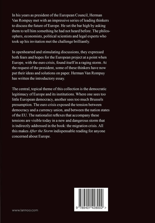 In his years as president of the European Council, Herman Van Rompuy met with an impressive series of leading thinkers to discuss the future of Europe. He set the bar high by asking them to tell him something he had not heard before. The philosophers, economists, political scientists and legal experts who took up his invitation met the challenge brilliantly. In openhearted and stimulating discussions, they expressed both fears and hopes for the European project at a point when Europe, with the euro crisis, found itself in a raging storm. At the request of the president, some of these thinkers have now put their ideas and solutions on paper. Herman Van Rompuy has written the introductory essay. The central, topical theme of this collection is the democratic legitimacy of Europe and its institutions. Where one sees too little European democracy, another sees too much Brussels presumption. The euro crisis exposed the tension between democracy and a currency union, and between the nation states of the EU. The nationalist refexes that accompany these tensions are visible today in a new and dangerous storm that is indirectly addressed in the book: the migration crisis. All this makes After the Storm indispensable reading for anyone concerned about Europe. Contributors: Herman Van Rompuy Rémi Brague Maurizio Ferrera Dieter Grimm Jürgen Habermas Turkuler Isiksel Ivan Krastev Koen Lenaerts David Miller Dani Rodrik Pierre Rosanvallon Fritz Scharpf Paul Schefer Amartya Sen Larry Siedentop Frank Vandenbroucke