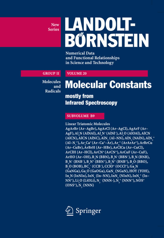 This volume, a Landolt-Bornstein publication, contains a comprehensive compilation of critically evaluated molecular constants of diatomic (A), linear triatomic (B), other triatomic (C) and other polyatomic (D) molecules.