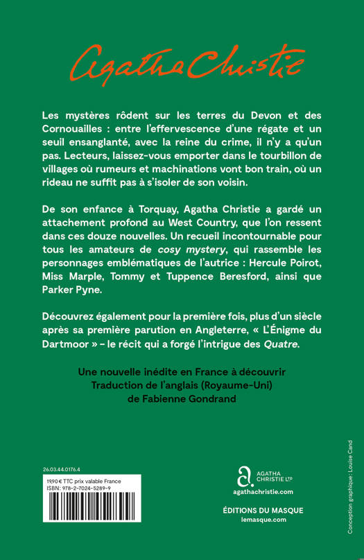 De son enfance à Torquay, Agatha Christie a gardé un attachement profond au West Country, que l’on ressent dans ces douze nouvelles. Un recueil incontournable pour tous les amateurs de cosy mystery, qui rassemble les personnages emblématiques de l’autrice : Hercule Poirot, Miss Marple, Tommy et Tuppence Beresford, ainsi que Parker Pyne.