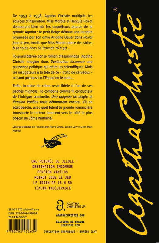 De 1953 à 1958, Agatha Christie multiplie les sources d’inspiration. Miss Marple et Hercule Poirot demeurent bien sûr les enquêteurs phares de la grande Agatha : le petit Belge dénoue une intrigue organisée par sa grande amie Ariadne Oliver dans Poirot joue le jeu, tandis que Miss Marple place des sbires à sa solde dans Le Train de 16 h 50…