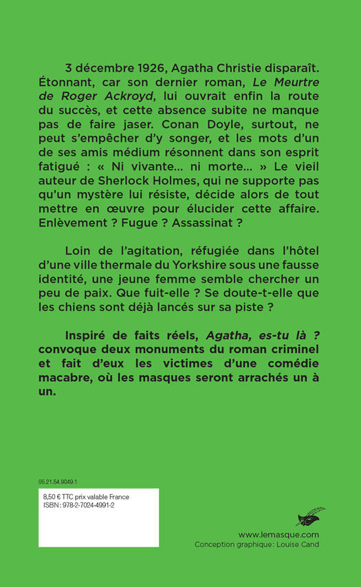 3 décembre 1926, Agatha Christie disparaît. Étonnant, car son dernier roman, Le Meurtre de Roger Ackroyd, lui ouvrait enfin la route du succès, et cette absence subite ne manque pas de faire jaser. Conan Doyle, surtout, ne peut s’empêcher d’y songer, et les mots d’un de ses amis médium résonnent dans son esprit fatigué : « Ni vivante… ni morte… » Le vieil auteur de Sherlock Holmes, qui ne supporte pas qu’un mystère lui résiste, décide alors de tout mettre en œuvre pour élucider cette affaire. Enlèvement ? Fugue ? Assassinat ?