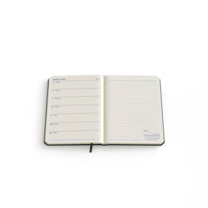 de KEMPEN P Weekly Notes EN, planning hebdomadaire à gauche, page de notes à droite, relié avec papier chamois dans une couverture souple, signet, page de garde marbré, tranches de papier de couleur, coins biseautés sur format 11 x16 cm.