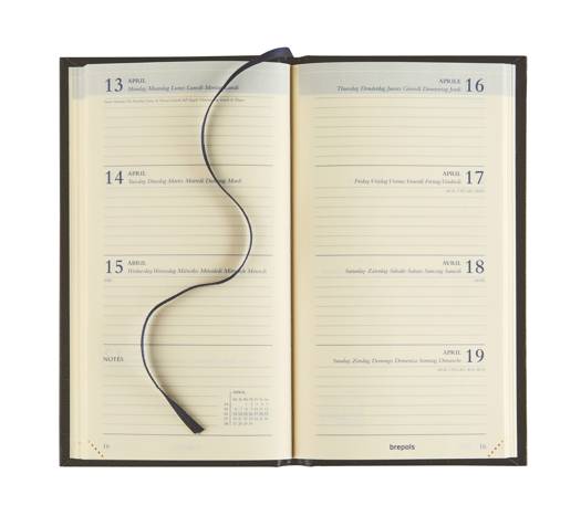 Brepols agenda Interplan Colora 1 semaine par 2 pages relié sextilingue sur papier chamois avec coins perforés et un signet dans une couverture souple en similicuir sur format 9 x 16 cm.