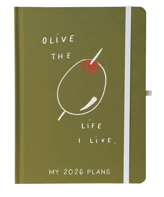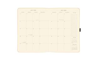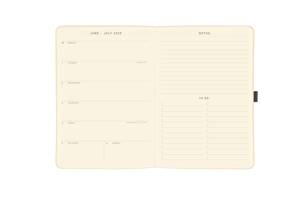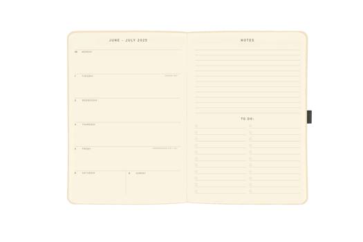 Agenda met een zachte omslag van vegan kunstleer. De agenda bevat 18 maanden, van juli 2025 tot december 2026. Inclusief wekelijkse en maandelijkse pagina's, notities, elastische sluiting en pennenlus. Afmeting: 20x15 centimeter.