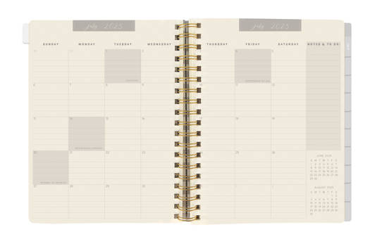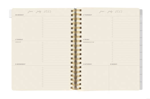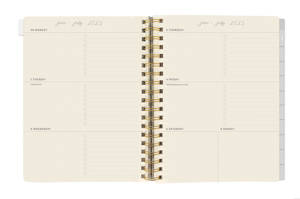 Agenda met een zachte omslag van vegan kunstleer. De agenda bevat 18 maanden, van juli 2025 tot december 2026. Inclusief wekelijkse en maandelijkse pagina's, notities, elastische sluiting en pennenlus. Afmeting: 20x15 centimeter.