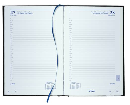 Brepols agenda Saturnus Luxe Tropical Flowers avec 1 jour par page quadrilingue par 1/2 heure (07:00-22:00u). Agenda relié avec papier blanc et coins perforés dans une couverture rigide sur format 13,3 x 20,8 cm.