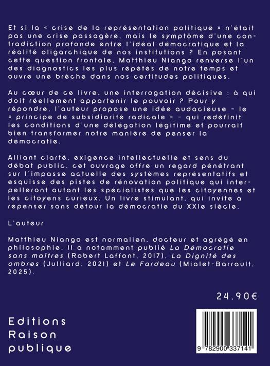Et si la "crise de la representation politique" n'était pas une crise passagère, mais le symptôme d'une contradiction profonde entre l'idéal démocratique et la réalité oligarchique de nos institutions ? En posant cette question frontale, Matthieu Niango renverse l'un des diagnostics les plus répétés de notre temps et ouvre une brèche dans nos certitudes politiques. Il en résulte une interrogation décisive : à qui doit réellement appartenir le pouvoir? Pour y répondre, l'auteur propose une idées audacieuse - le "principe de subsidiarité radicale" - qui redéfinit les conditions d'une délégation légitime et pourrait bien transformer notre manière de penser la démocratie. Alliant clarté, exigence intellectuelle et sens du débat public, cet ouvrage offre un regard pénétrant sur l'impasse actuelle des systèmes représentatifs et esquisse des pistes de rénovation politique qui interpelleront autant les spécialistes que les citoyennes et citoyens. Un livre stimulant, qui invite à repenser sans détour la démocratie du XXIe siècle.