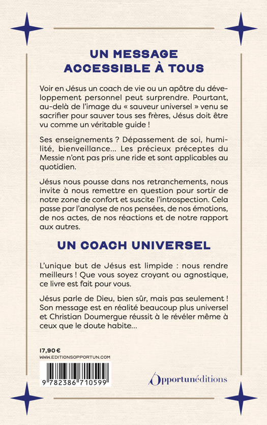 Voir en Jésus un coach de vie ou un apôtre du développement personnel peut surprendre. Pourtant, au-delà de l’image du « sauveur universel » venu se sacrifier pour sauver tous ses frères, Jésus doit être vu comme un véritable guide ! Ses enseignements ? Dépassement de soi, humilité, bienveillance… Les précieux préceptes du Messie n’ont pas pris une ride et sont applicables au quotidien. Jésus nous pousse dans nos retranchements, nous invite à nous remettre en question pour sortir de notre zone de confort et suscite l’introspection. Cela passe par l’analyse de nos pensées, de nos émotions, de nos actes, de nos réactions et de notre rapport aux autres. L’unique but de Jésus est limpide : nous rendre meilleurs ! Que vous soyez croyant ou agnostique, ce livre est fait pour vous. Jésus parle de Dieu, bien sûr, mais pas seulement ! Son message est en réalité beaucoup plus universel et Christian Doumergue réussit à le révéler même à ceux que le doute habite…
