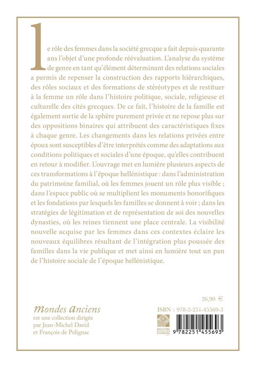 Le role des femmes dans la societe grecque a fait depuis quarante ans l'objet d'une profonde reevaluation. L'analyse du systeme de genre en tant qu'element determinant des relations sociales a permis de repenser la construction des rapports hierarchiques, des roles sociaux et des formations de stereotypes et de restituer a la femme un role dans l'histoire politique, sociale, religieuse et culturelle des cites grecques. De ce fait, l'histoire de la famille est egalement sortie de la sphere purement privee et ne repose plus sur des oppositions binaires qui attribuent des caracteristiques fixes a chaque genre. Les changements dans les relations privees entre epoux sont susceptibles d'etre interpretes comme des adaptations aux conditions politiques et sociales d'une epoque, qu'elles contribuent en retour a modifier. L'ouvrage met en lumiere plusieurs aspects de ces transformations a l'epoque hellenistique: dans l'administration du patrimoine familial, ou les femmes jouent un role plus visible; dans l'espace public ou se multiplient les monuments honorifiques et les fondations par lesquels les familles se donnent a voir; dans les strategies de legitimation et de representation de soi des nouvelles dynasties, ou les reines tiennent une place centrale. La visibilite nouvelle acquise par les femmes dans ces contextes eclaire les nouveaux equilibres resultant de l'integration plus poussee des familles dans la vie publique et met ainsi en lumiere tout un pan de l'histoire sociale de l'epoque hellenistique.