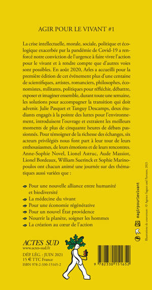 La crise intellectuelle, morale, sociale, politique et écologique exacerbée par la pandémie de Covid-19 a renforcé notre conviction de l'urgence à faire vivre l'action pour le vivant et à rendre compte que d'autres voies sont possibles. En août 2020, Arles a accueilli pour la première édition de cet événement plus d'une centaine de scientifiques, artistes, romanciers, philosophes, économistes, militants, politiques pour réfléchir, débattre, exposer et imaginer ensemble, durant toute une semaine, les solutions pour accompagner la transition qui doit advenir. Julie Pasquet et Tanguy Descamps, deux étudiants engagés à la pointe des luttes pour l'environnement, introduisent l'ouvrage et extraient les meilleurs moments de plus de cinquante heures de débats passionnés. Pour témoigner de la richesse des échanges, six acteurs privilégiés nous font part à leur tour de leurs enthousiasmes, de leurs émotions et de leurs rencontres. Anne-Sophie Novel, Lionel Astruc, Aude Massiot, Lionel Bordeaux, William Suerinck et Sophie Marinopoulos ont chacun animé une journée sur des thématiques aussi variées que :