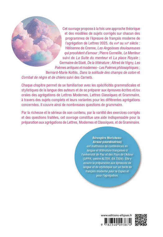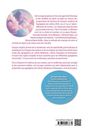 Chaque chapitre permet de se familiariser avec les spécificités grammaticales et stylistiques de la langue des auteurs et de se préparer aux épreuves écrites et/ou orales des agrégations de Lettres Modernes, Lettres Classiques et Grammaire, à travers des sujets complets et leurs variantes pour les différentes agrégations concernées. Il couvre ainsi de nombreuses questions de grammaire.