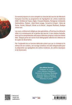 Ce manuel propose un cours complet sur chacune des œuvres de littérature française inscrites au programme de l’agrégation de Lettres modernes 2026 : Cligès de Chrétien de Troyes ; Pantagruel de François Rabelais ; Poésies d'Antoinette Deshoulières, ; Turcaret et Crispin d'Alain-René Lesage ; Ourika, Édouard, Olivier ou le Secret de Claire de Duras ; Quelque chose noir de Jacques Roubaud.