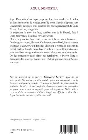 Agur Donostia, c'est la pierre plate, les chemins de l'exil où les enfants n'ont plus de visage, plus de nom. Ils regardent la mort en face, combattants de la liberté, face à leurs bourreaux, ils ont le rire aux dents. De rivage en rivage, ils vont. On les rencontre là où fl eurissent les orangers d'Espagne ou dans les villes où le vent a la couleur du ciel et parfois dans le brouillard d'embruns des villes portuaires, les cimetières des grandes cités pleins de cyprès et d'écureuils.