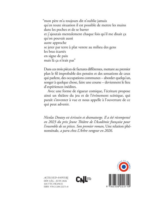 Dans ces trois pièces de factures différentes, mettant au premier plan le fil improbable des pensées et des sensations de ceux qui parlent, des occupations communes - aborder quelqu'un, songer à quelque chose, faire une course - deviennent le lieu d'expériences inédites. Avec une forme de rigueur comique, l'écriture propose ainsi un théâtre du jeu et de l'événement scénique, qui paraît s'inventer à vue et nous appelle à l'ouverture de ce qui peut advenir.