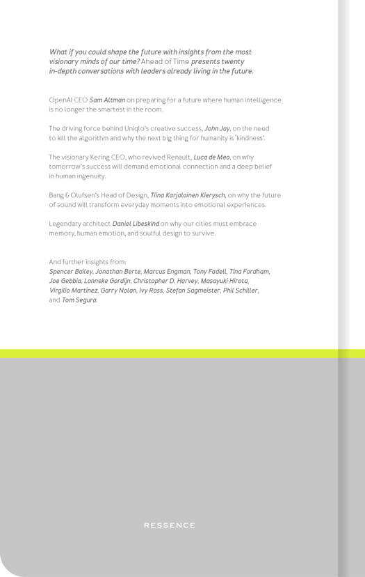 Ahead of Time. Whilst Ressence is a luxury watch brand, this is no homage to the industry - instead the title profiles creatives across a range of fields whose work embodies the Ressence philosophy: to re-imagine the essential. In the book, entrepreneurial visionaries share their perspectives on the future within their respective fields creating an inspiring, collectible volume that offers a positive, informed perspective on where we are all heading.