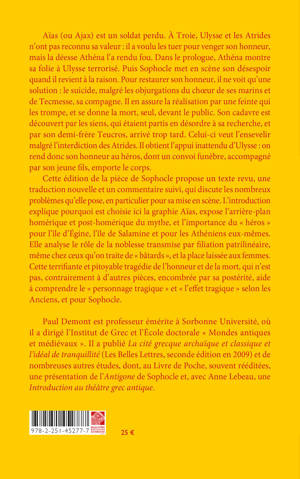 Aias (ou Ajax) est un soldat perdu. A Troie, Ulysse et les Atrides n'ont pas reconnu sa valeur: il a voulu les tuer pour venger son honneur, mais la deesse Athena l'a rendu fou. Dans le prologue, Athena montre sa folie a Ulysse terrorise. Puis Sophocle met en scene son desespoir quand il revient a la raison. Pour restaurer son honneur, il ne voit qu'une solution: le suicide, malgre les objurgations du choeur de ses marins et de Tecmesse, sa compagne. Il en assure la realisation par une feinte qui les trompe, et se donne la mort, seul, devant le public. Son cadavre est decouvert par les siens, qui etaient partis en desordre a sa recherche, et par son demi-frere Teucros, arrive trop tard. Celui-ci veut l'ensevelir malgre l'interdiction des Atrides. Il obtient l'appui inattendu d'Ulysse: on rend donc son honneur au heros, dont un convoi funebre, accompagne par son jeune fils, emporte le corps. Cette edition de la piece de Sophocle propose un texte revu, une traduction nouvelle et un commentaire suivi, qui discute les nombreux problemes qu'elle pose, en particulier pour sa mise en scene. L'introduction explique pourquoi est choisie ici la graphie Aias, expose l'arriere-plan homerique et post-homerique du mythe, et l'importance du heros pour l'ile d'Egine, l'ile de Salamine et pour les Atheniens eux-memes. Elle analyse le role de la noblesse transmise par filiation patrilineaire, meme chez ceux qu'on traite de batards , et la place laissee aux femmes. Cette terrifiante et pitoyable tragedie de l'honneur et de la mort, qui n'est pas, contrairement a d'autres pieces, encombree par sa posterite, aide a comprendre le personnage tragique et l'effet tragique selon les Anciens, et pour Sophocle.