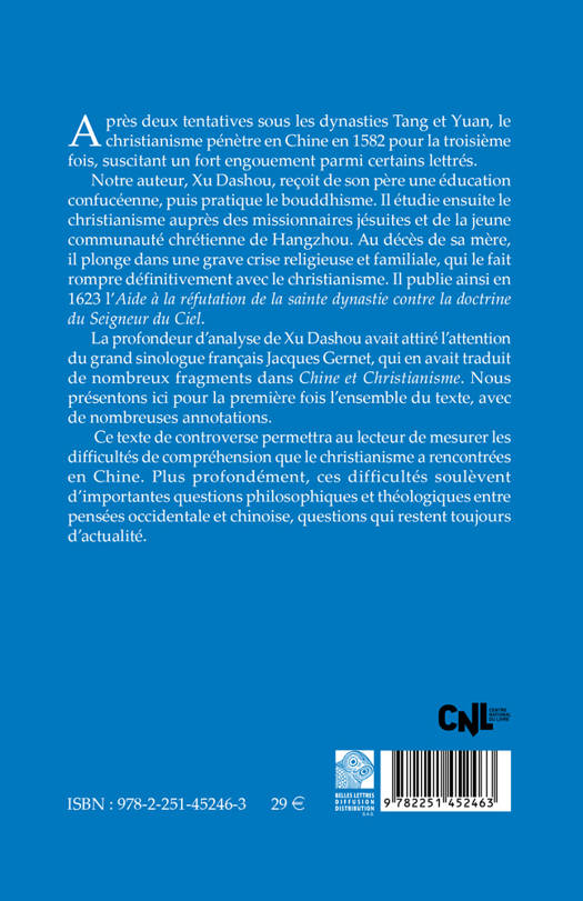 Apres deux tentatives sous les dynasties Tang et Yuan, le christianisme penetre en Chine en 1582 pour la troisieme fois, suscitant un fort engouement parmi certains lettres. Notre auteur, Xu Dashou, recoit de son pere une education confuceenne, puis pratique le bouddhisme. Il etudie ensuite le christianisme aupres des missionnaires jesuites et de la jeune communaute chretienne de Hangzhou. Au deces de sa mere, il plonge dans une grave crise religieuse et familiale, qui le fait rompre definitivement avec le christianisme. Il publie ainsi en 1623 l'Aide a la refutation de la sainte dynastie contre la doctrine du Seigneur du Ciel. La profondeur d'analyse de Xu Dashou avait attire l'attention du grand sinologue francais Jacques Gernet, qui en avait traduit de nombreux fragments dans Chine et Christianisme. Nous presentons ici pour la premiere fois l'ensemble du texte, avec de nombreuses annotations. Ce texte de controverse permettra au lecteur de mesurer les difficultes de comprehension que le christianisme a rencontrees en Chine. Plus profondement, ces difficultes soulevent d'importantes questions philosophiques et theologiques entre pensees occidentale et chinoise, questions qui restent toujours d'actualite.