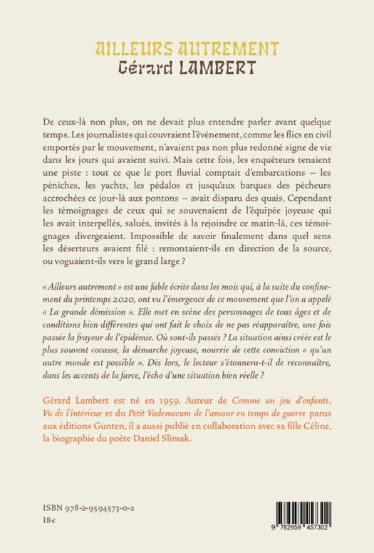 « Ailleurs, autrement » est une fable écrite dans les mois qui, à la suite du confinement du printemps 2020, ont vu l’émergence de ce mouvement que l’on a appelé « La grande démission ». Elle met en scène des personnages de tous âges et de conditions bien différentes qui ont fait le choix de ne pas réapparaître, une fois passée la frayeur de l’épidémie. Où sont-ils passés ? La situation ainsi créée est le plus souvent cocasse, la démarche joyeuse, nourrie de cette conviction "qu’un autre monde est possible". Dès lors, le lecteur s’étonnera-t-il de reconnaître, dans les accents de la farce, l’écho d’une situation bien réelle ?