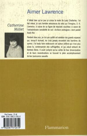 "Il fallait bien qu'un jour je croise la route de Lady Chatterley. J'ai fait mieux, je suis tombée amoureuse de celui qui l'imagina, D. H. Lawrence, à cause de sa figure de mauvais coucheur, à cause de l'extraordinaire sensibilité de son écriture androgyne dont parlait Anaïs Nin.Pendant deux ans, je n'ai pas quitté cet amateur des grands espaces qui, lorsqu'il écrivait, ne s'est jamais encombré des barrières du surmoi. J'ai voulu faire redécouvrir cet auteur célèbre qui n'est plus assez lu, contemporain des suffragettes, et qui vécut entouré defemmes libres. Il avait compris qu'au vortex de leur émancipation et de leurs revendications se trouvait le plein accomplissement de leur jouissance sexuelle."Catherine Millet.
