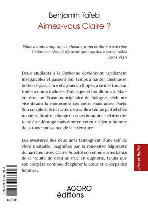 Deux étudiants à la Sorbonne deviennent rapidement inséparables et passent leur temps à hanter cinémas et boîtes de jazz, à lire et à jouer au flipper, à se dire tout sur tout – amours incluses. Fantasque et bouillonnant, Marco, étudiant Erasmus originaire de Bologne, déchante vite devant la monotonie des cours mais adore Paris. Son complice, le narrateur, travaille à temps partiel chez un vieux libraire ; plongé dans ses bouquins, celui-ci déteste être dérangé mais aime entretenir le jeune homme de la toute-puissance de la littérature. Les aventures des deux amis témoignent d’une soif de vivre insatiable, magnifiée par la rencontre fulgurante du narrateur avec Claire. Claire ressemble à ces "beautés célestes à l’intelligence vive que l’on admire dans les comédies, ces héroïnes à la répartie fine dont on cherche en vain les défauts". Aussitôt l'ennui du narrateur sur les bancs de la faculté de droit se mue en euphorie, tandis que son compère continue d’explorer le coeur et le corps des femmes. Commence alors une partie à pas chassés, presque du ballet, où le marivaudage et l’érotisme cèdent, l’air de rien, à une tension dramatique croissante, jusqu’à son dénouement aussi inéluctable qu’inattendu. D’un classicisme revu aux couleurs du contemporain, l’écriture rythmée de Benjamin Taïeb nous régale de descriptions précises, au vocabulaire d’une grande richesse ; pris dans le tourbillon d'un Paris idéal, ses personnages se mettent à vivre sous nos yeux, entre grâce et passion. Benjamin TAÏEB est né à Paris et vit à Nice, où il travaille comme avocat. Il est l'auteur de pièces de théâtre et de récits personnels, dont "Classe de Mer" et "Ma (dé)conversion", adaptés tous deux en scénarios de bd aux éditions Les Enfants rouges. Après "Premier amour" (2024), il continue d’ausculter dans Aimez-vous Claire ? le sentiment amoureux, nostalgique d’un bonheur projeté.