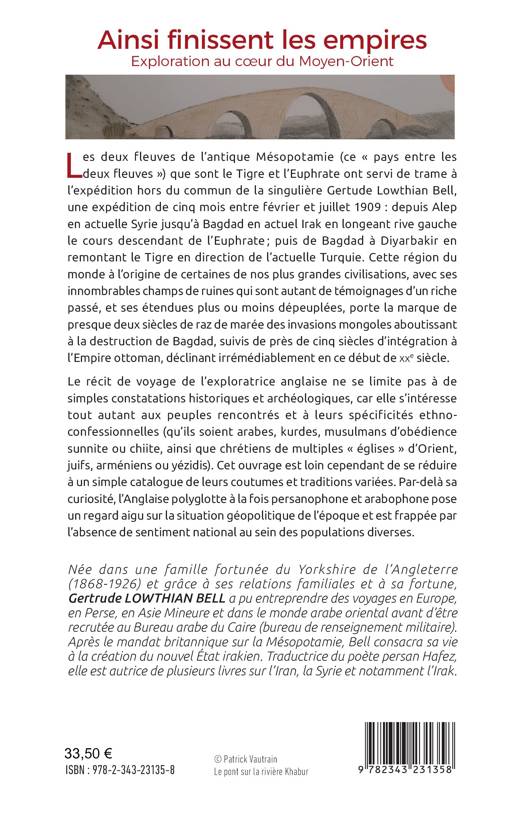 Les deux fleuves de l’antique Mésopotamie que sont le Tigre et l’Euphrate ont servi de trame à l’expédition hors du commun de Gertude Lowthian Bell, une expédition de cinq mois entre février et juillet 1909. Cette région du monde, avec ses innombrables champs de ruines qui sont autant de témoignages d’un riche passé, et ses étendues plus ou moins dépeuplées, porte la marque de presque deux siècles de raz de marée des invasions mongoles, suivis de près de cinq siècles d’intégration à l’Empire ottoman. Le récit de voyage de l’exploratrice anglaise ne se limite pas à de simples constatations historiques et archéologiques, elle s’intéresse tout autant aux peuples rencontrés et à leurs spécificités ethno-confessionnelles. Loin de se réduire à un simple catalogue des coutumes et traditions variées, ce récit pose un regard aigu sur la situation géopolitique de l’époque.