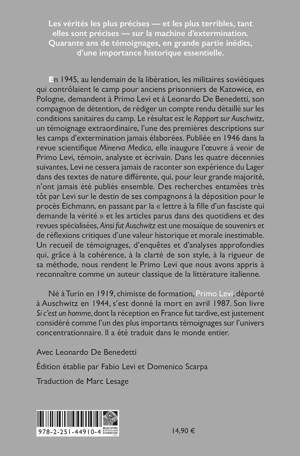 En 1945, au lendemain de la libération, les militaires soviétiques qui contrôlaient le camp pour anciens prisonniers de Katowice, en Pologne, demandent à Primo Levi et à Leonardo De Benedetti, son compagnon de détention, de rédiger un compte rendu détaillé sur les conditions sanitaires du camp. Le résultat est le Rapport sur Auschwitz, un témoignage extraordinaire, l’une des premières descriptions sur les camps d’extermination jamais élaborées. Publiée en 1946 dans la revue scientifique Minerva Medica, elle inaugure l’œuvre à venir de Primo Levi, témoin, analyste et écrivain. Dans les quatre décennies suivantes, Levi ne cessera jamais de raconter son expérience du Lager dans des textes de nature différente, qui, pour leur grande majorité, n’ont jamais été publiés ensemble. Des recherches entamées très tôt par Levi sur le destin de ses compagnons à la déposition pour le procès Eichmann, en passant par la « lettre à la fille d’un fasciste qui demande la vérité » et les articles parus dans des quotidiens et des revues spécialisées, Ainsi fut Auschwitz est une mosaïque de souvenirs et de réflexions critiques d’une valeur historique et morale inestimable.