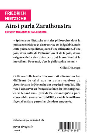 Cette nouvelle traduction voudrait affirmer un ton diffèrent de celui que les autres versions du «Zarathoustra» de Nietzsche ont perpétué jusqu'ici. Elle vise à conserver en français la force du texte original, en se tenant aussi près de l'allemand qu'il a paru concevable ; souvent cette fidélité a semblé la meilleure façon d'en faire passer la splendeur emportée.