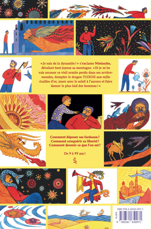 Retiré dans les montagnes, Nietzsche a trouvé le sens de la terre et la beauté de la vie. Il retourne désormais auprès des hommes pour leur offrir ce merveilleux cadeau : mais ceux-ci sont prisonniers du terrible dragon Tudois, de leurs craintes et de leurs rancoeurs. Leur montrer le chemin de la joie s'avère plus ardu que prévu... On redécouvre ici la pensée d'un des plus grands philosophes de l'histoire : une pensée rebelle, engagée et surtout joyeuse. La plume enchanteresse de l'auteur fait revivre pour les jeunes lecteurs la mythologie nietzschéenne développée dans Ainsi parlait Zarathoustra : un univers fascinant et fantastique. Ainsi parlait Nietzsche est un véritable récit initiatique dont on ressort grandi.