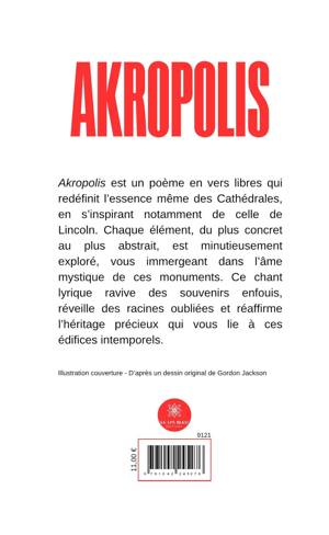 Akropolis est un poème en vers libres qui redéfinit l'essence même des Cathédrales, en s'inspirant notamment de celle de Lincoln. Chaque élément, du plus concret au plus abstrait, est minutieusement exploré, vous immergeant dans l'âme mystique de ces monuments. Ce chant lyrique ravive des souvenirs enfouis, réveille des racines oubliées et réaffirme l'héritage précieux qui vous lie à ces édifices intemporels.