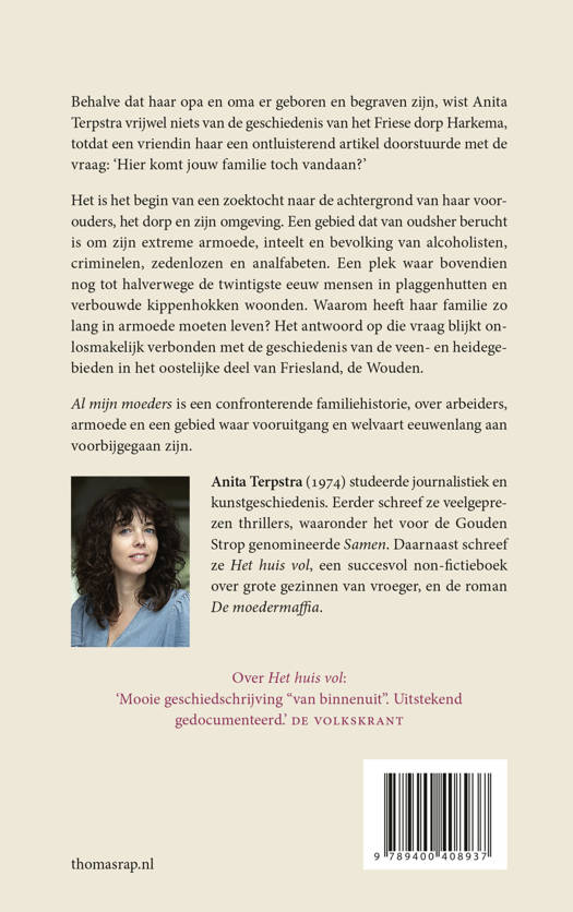 Behalve dat haar opa en oma er geboren en begraven zijn, wist Anita Terpstra vrijwel niets van de geschiedenis van het Friese dorp Harkema, totdat een vriendin haar een artikel doorstuurde met de vraag: ‘Hier komt jouw familie toch vandaan?’ Het is het begin van een zoektocht naar de achtergrond van haar voorouders, het dorp en zijn omgeving. Een plek die van oudsher berucht was om zijn extreme armoede, plaggenhutten, inteelt en bevolking van alcoholisten, raddraaiers, zedelozen en analfabeten. Een plek waar bovendien nog tot halverwege de twintigste eeuw mensen in verbouwde kippenhokken woonden. Al mijn moeders is een confronterende familiehistorie, diep geworteld in de Friese veengebieden.