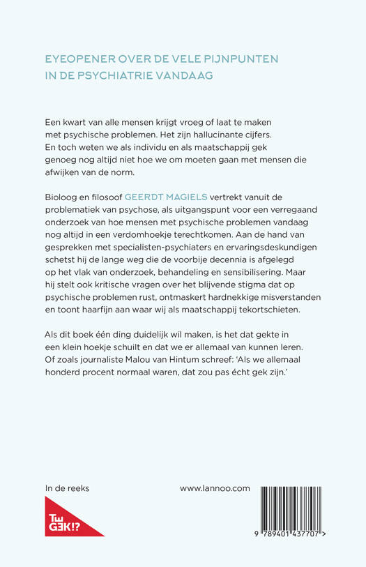 Eyeopener over de vele pijnpunten in de psychiatrie vandaag Een kwart van alle mensen krijgt vroeg of laat te maken met psychische problemen. Het zijn hallucinante cijfers. En toch weten we als individu en als maatschappij gek genoeg nog altijd niet hoe we om moeten gaan met mensen die afwijken van de norm. Bioloog en filosoof Geerdt Magiels vertrekt vanuit de problematiek van psychose, als uitgangspunt voor een verregaand onderzoek van hoe mensen met psychische problemen vandaag nog altijd in een verdomhoekje terechtkomen. Aan de hand van gesprekken met specialisten-psychiaters en ervaringsdeskundigen schetst hij de lange weg die de voorbije decennia is afgelegd op het vlak van onderzoek, behandeling en sensibilisering. Maar hij stelt ook kritische vragen over het blijvende stigma dat op psychische problemen rust, ontmaskert hardnekkige misverstanden en toont haarfijn aan waar wij als maatschappij tekortschieten. Als dit boek één ding duidelijk wil maken, is het dat gekte in een klein hoekje schuilt en dat we er allemaal van kunnen leren. Of zoals journaliste Malou van Hintum schreef: 'Als we allemaal honderd procent normaal waren, dat zou pas écht gek zijn.'