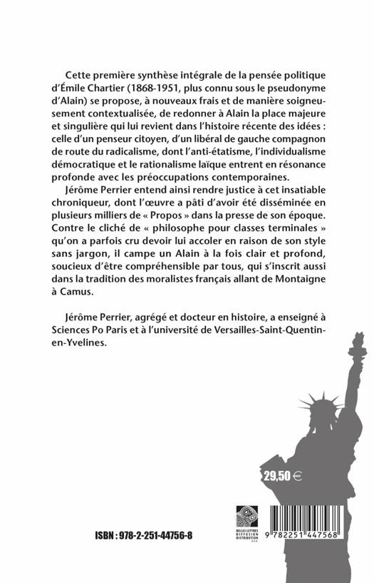 Cette premiere synthese integrale de la pensee politique d'Emile Chartier (1868-1951, plus connu sous le pseudonyme d'Alain) se propose, a nouveaux frais et de maniere soigneusement contextualisee, de redonner a Alain la place majeure et singuliere qui lui revient dans l'histoire recente des idees: celle d'un penseur citoyen, d'un liberal de gauche compagnon de route du radicalisme, dont l'anti-etatisme, l'individualisme democratique et le rationalisme laique entrent en resonance profonde avec les preoccupations contemporaines. Jerome Perrier entend ainsi rendre justice a cet insatiable chroniqueur, dont l'oeuvre a pati d'avoir ete disseminee en plusieurs milliers de Propos dans la presse de son epoque. Contre le cliche de philosophe pour classes terminales qu'on a parfois cru devoir lui accoler en raison de son style sans jargon, il campe un Alain a la fois clair et profond, soucieux d'etre comprehensible par tous, qui s'inscrit aussi dans la tradition des moralistes francais allant de Montaigne a Camus